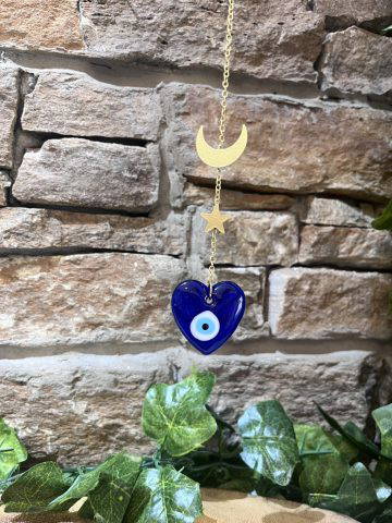 The all seeing eye offers spiritual protection. The eye stares back at the world to shield you from negativity and harm. Glass heart shaped charm with moon and star detail on 18cm long chain to hang at your altar, in your home or in your car to keep you safe.