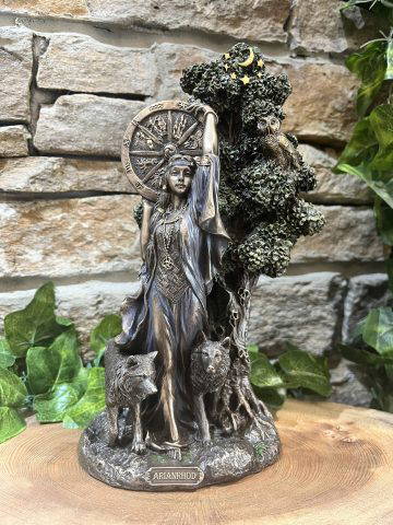 Wonderfully detailed Arianrhod figure in bronze finish with plenty of detail. The goddess of fate with her wolf companions and zodiac shield. A beautiful grand piece for your home or altar.