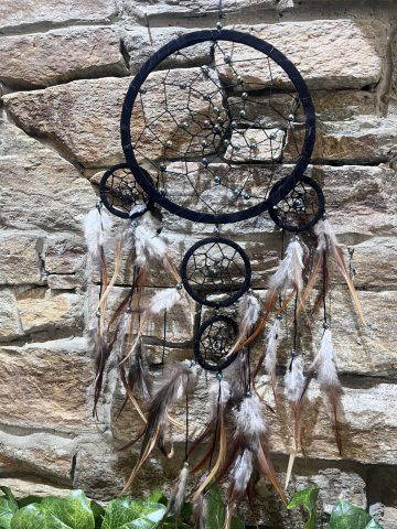Soft black and brown dreamcatcher with fluffy feathers to finish. Hang in the room to catch bad dreams and allow the good ones to pass through to you as you sleep. 16cm in diameter