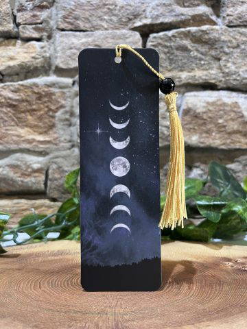 Bookmark card with crystal bead and golden tassel depicting the phases of the moon.