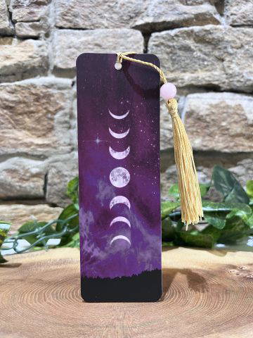 Bookmark card with crystal bead and golden tassel depicting the phases of the moon.