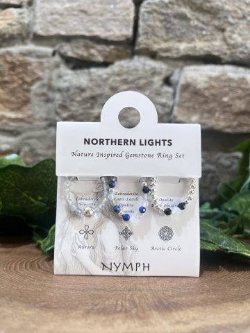 Beautiful sparkling gem stone crystal stretch rings inspired by nature. With opalite, labradorite, lapis lazuli and obsidian. Set of 3 by Nymph