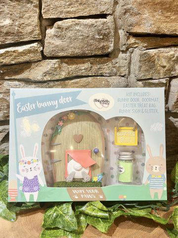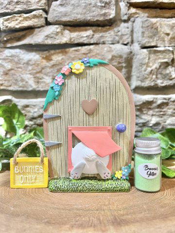Beautiful Easter Bunny door gift set comprising the resin door, bunnies only door hanger, bunny glitter, egg hunt bag plus a cut out doormat! All of the perfect accessories to welcome Easter bunnies and Easter fairies into your home and garden!