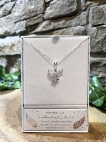dainty guardian angel pendant with sparkle, plated in real silver, comes in a pretty white and silver presentation box. Pendant measures 2cm