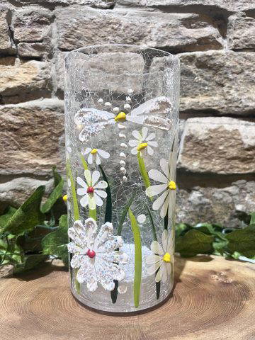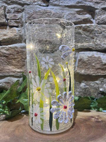 Beautiful LED light up crackled affect glass tube light with daisy and dragonfly design! 3x AA batteries required included.