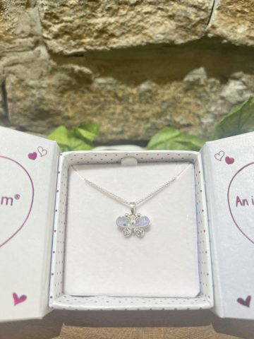 Pretty little sparkling butterfly necklace with 30cm chain at its smallest hook, can be extended. Pendant measures 1cm in length. Comes in a lovely little spotted gift box.
