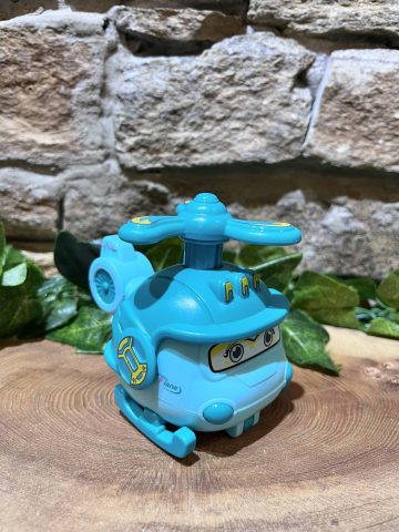 Brightly coloured helicopter with rubber wheels, simply push down the top and watch it go!