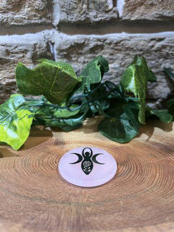 Rose quartz is known for its ability to help our heart heal, for self love and relationship support. A bubble bath for your emotions. Beautiful smooth disc shaped worry stone with a silver embossed triple goddess symbol.
