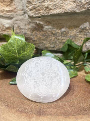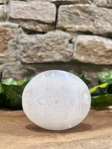 Use Selenite to clear all negative energy, also used to clear or cleanse other crystals. For calm, peace and wellbeing. Beautiful smooth polished large palm stone with the intricate etching of the Mandala