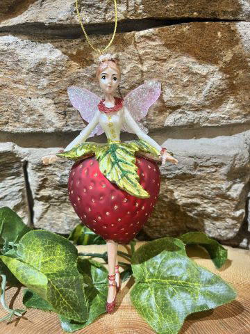 Pretty large fairy on strawberry glass bauble, a sweet addition to your festive displays!
