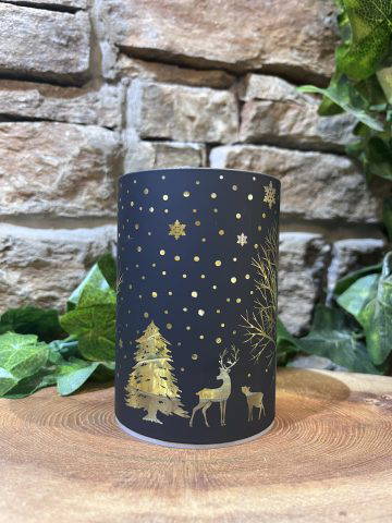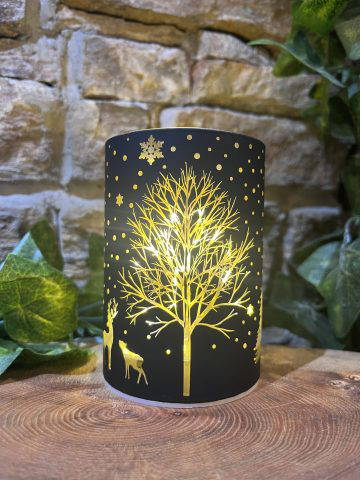 Soft glow festive woodland scene glass lamp. Requires 3 AAA batteries supplied.
